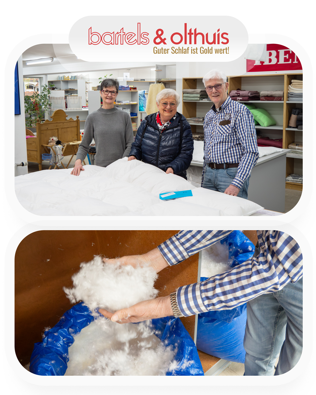 Während sich die Erwachsenen bei uns auf Matratzen ausstrecken, in Bademäntel einkuscheln oder flauschige Daunen fühlen, können die Kinder in der Spielecke auf eine eigene Entdeckungsreise gehen. So erleben Groß und Klein ein entspanntes Einkaufserlebnis in angenehmer Atmosphäre. Wir legen großen Wert darauf, ein Geschäft für die ganze Familie zu sein. Dies spiegelt sich auch in unserem vielseitigen Produktsortiment wider, das allen Altersgruppen große Auswahl bietet.